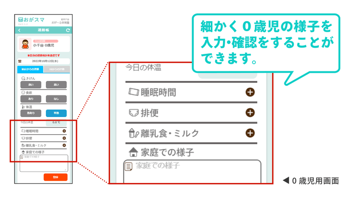 新潟県様式の「連絡帳」の特徴として0歳児の [ 睡眠・排便・食事 ] の入力が細かにできるものとなっております。