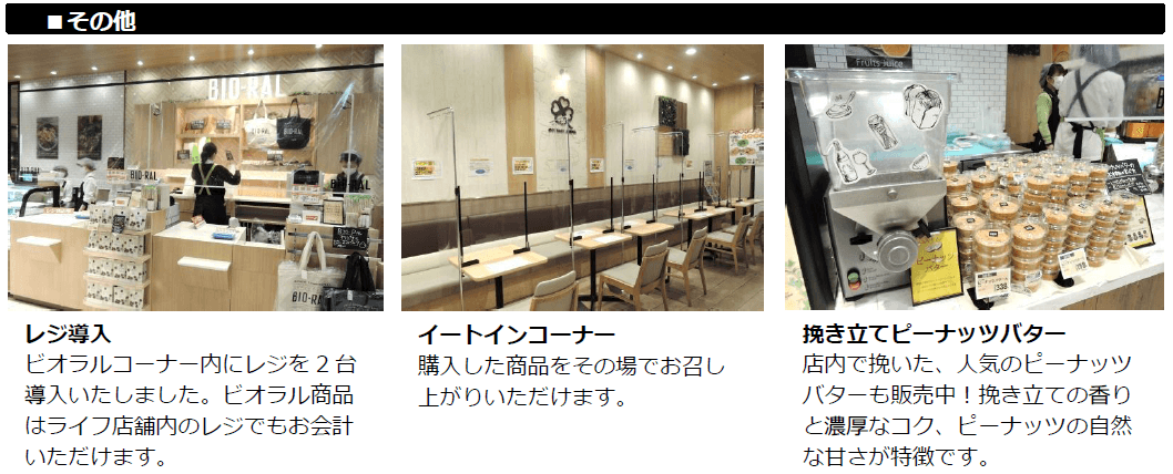 コロナ禍によりさらに高まる健康志向や安全・安心へのニーズにお応えするため、売り場を拡張し「オーガニック・ローカル・ヘルシー・サスティナビリティー」にこだわった商品を展開する大型ビオラルコーナーを導入いたしました。自然の恵みを生かした“オーガニック”商品、埼玉県のおいしい“ローカル”商品、体に優しい“ヘルシー”商品などを豊富に取りそろえ、お客様の心と体の健康と豊かな毎日をお手伝いしてまいります。