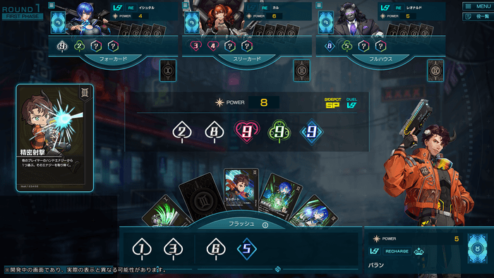 通常のポーカーと異なる点は、プレイヤーが『コマンドカード』の力を借りて、トランプカードの数字を変える、一部の役を封じるといった特殊能力を使用できることです。