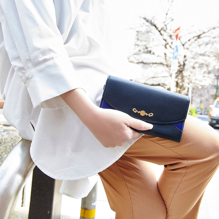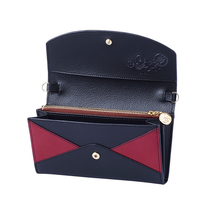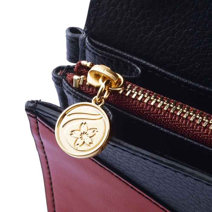 内装は太宰のコスチュームをイメージした柄をベースに機能性のある仕切りポケット、蓮の花と歯車をさりげなく型押ししました。