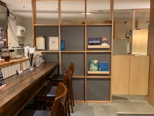 ・置かれている書籍は鶴舞中央図書館の協力で、50冊程度が並び、その選書は本学学生グループ「サカバンブックス」が担当。書籍は定期的に入れ替えられ、食やお酒に関する本のほか、同店舗が発酵食材にも力を入れているため、発酵に関する書籍も設置。