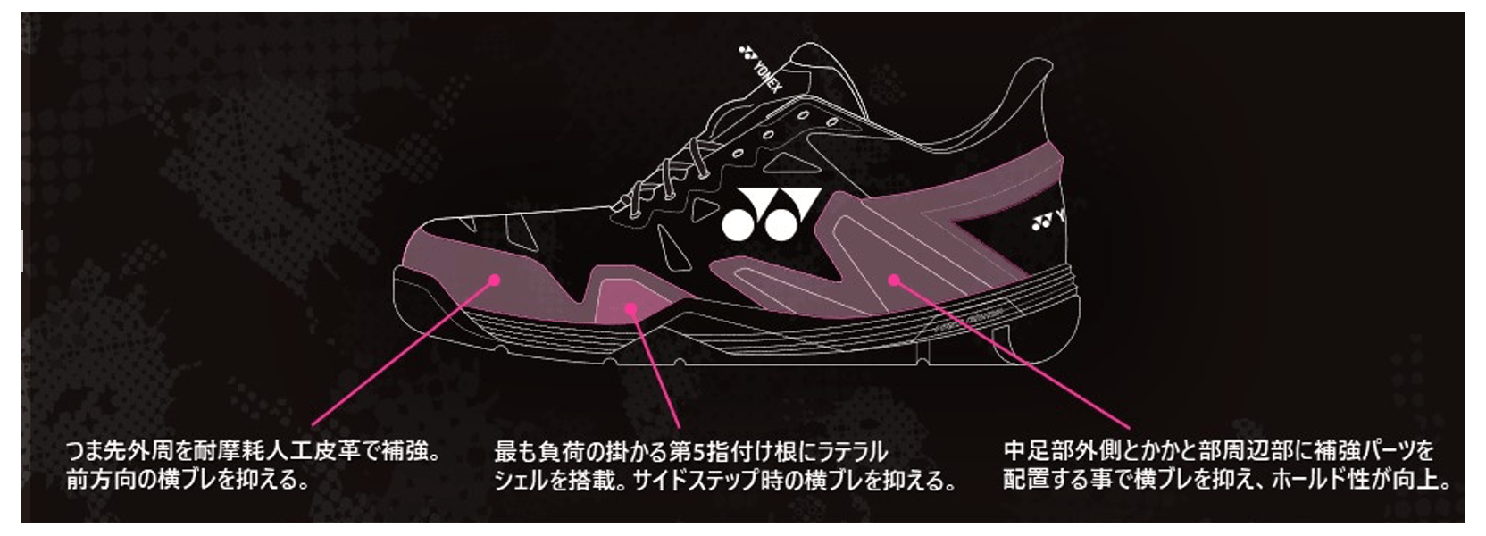 最も負担のかかる部分を支えるように配置した「ラテラルシェル」と、補強パーツ「スタビリティリインフォースメント」が横ブレを軽減。 俊敏なフットワークをアシストします。