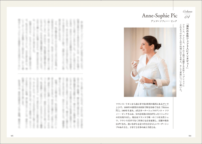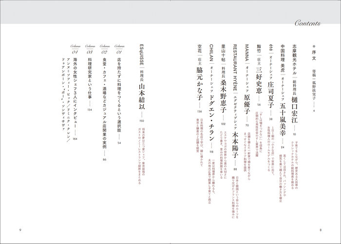 彼女たちのこれまでの歩み、生き方、女性シェフとしての苦悩、店や料理に対する考え、家族についてなどをロングインタビュー。1日のスケジュールやシグネチャーディッシュのレシピ、美しい料理写真、想い出の写真など、余すことなく紹介します。コラムでは「海外の女性シェフ3人にインタビュー」と題して、フランス、アメリカ、タイの3国で活躍するトップシェフのインタビューなどを掲載。店を持たない料理人や料理研究家の事例についても紹介します。