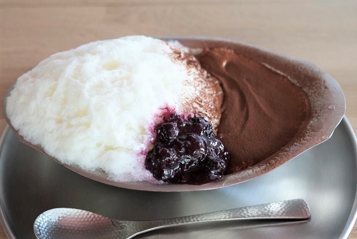 味はティラミス、見た目はカレーな変わり種かき氷。福神漬けに見立てたベリーソースで味変。