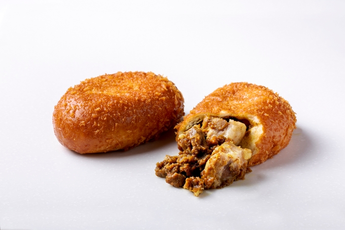 愛媛のブランド豚「甘とろ豚」肉を具材に使用。和風出汁カレーを、山芋を練り込んだもちもちパン生地で包み込む。