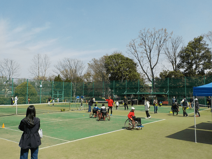 競技用の車いすに座って、テニス体験ができます。東京パラリンピック日本代表、銅メダリストの菅野浩二選手から直接指導を受けることができます。