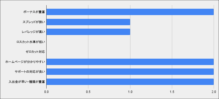 スプレッドが非常に狭く、日本時間早朝でのスプレッドの開きも他の業者と比べて小さいところが一番気に入っています。また、キャッシュバックサイトとの連携も多くされていることから、お得に運用することができます。あと、不明点は日本語対応でチャット形式で質問できるところは便利でした。