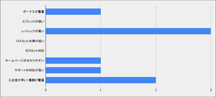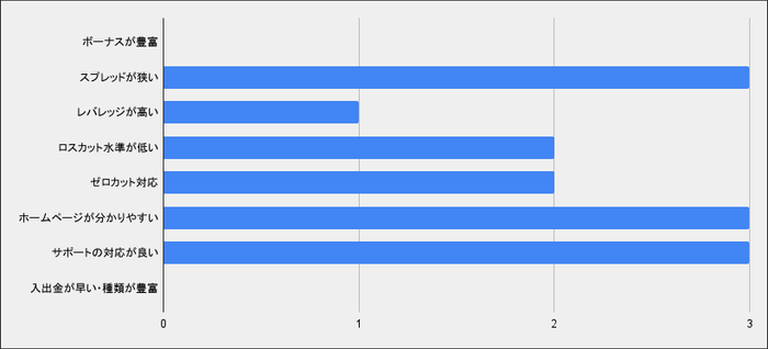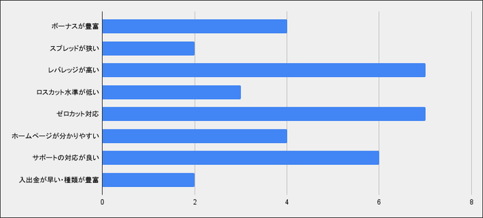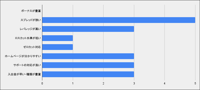 TitanFXはボーナスがないため、選ぶ人はいませんでしたが、「スプレッドが狭い」にチェックをした人がほとんどでした。