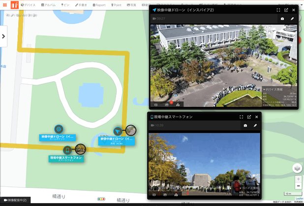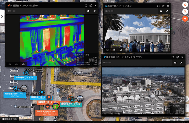 今回の訓練でリアルグローブは、リアルタイム情報配信システム「Hec-Eye(ヘックアイ)」を用いてドローンおよびスマートフォンの複数デバイスでの中継を実施。リアルタイムな映像中継と位置情報の共有により、本部側での迅速な状況把握を支援しました。