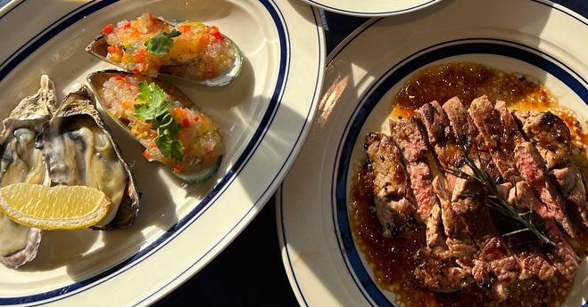 グリーンサラダ / ミネストローネ / パーナ貝・牡蠣 / パン / グラスフェッドステーキ / 食後のコーヒー