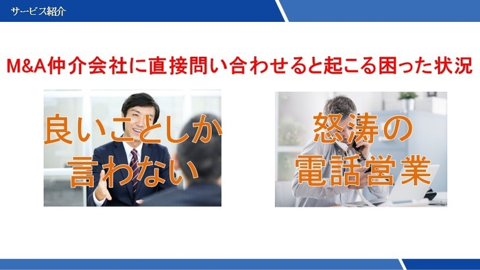加えて、M&A仲介会社に直接問い合わせると「良いことしか言わない営業トーク」と「しつこい電話営業」という二つの問題に直面するケースが多く、経営者は貴重な時間を奪われる状況に陥ることが多々あり、トラブル事例も既に多発しています。