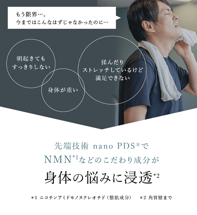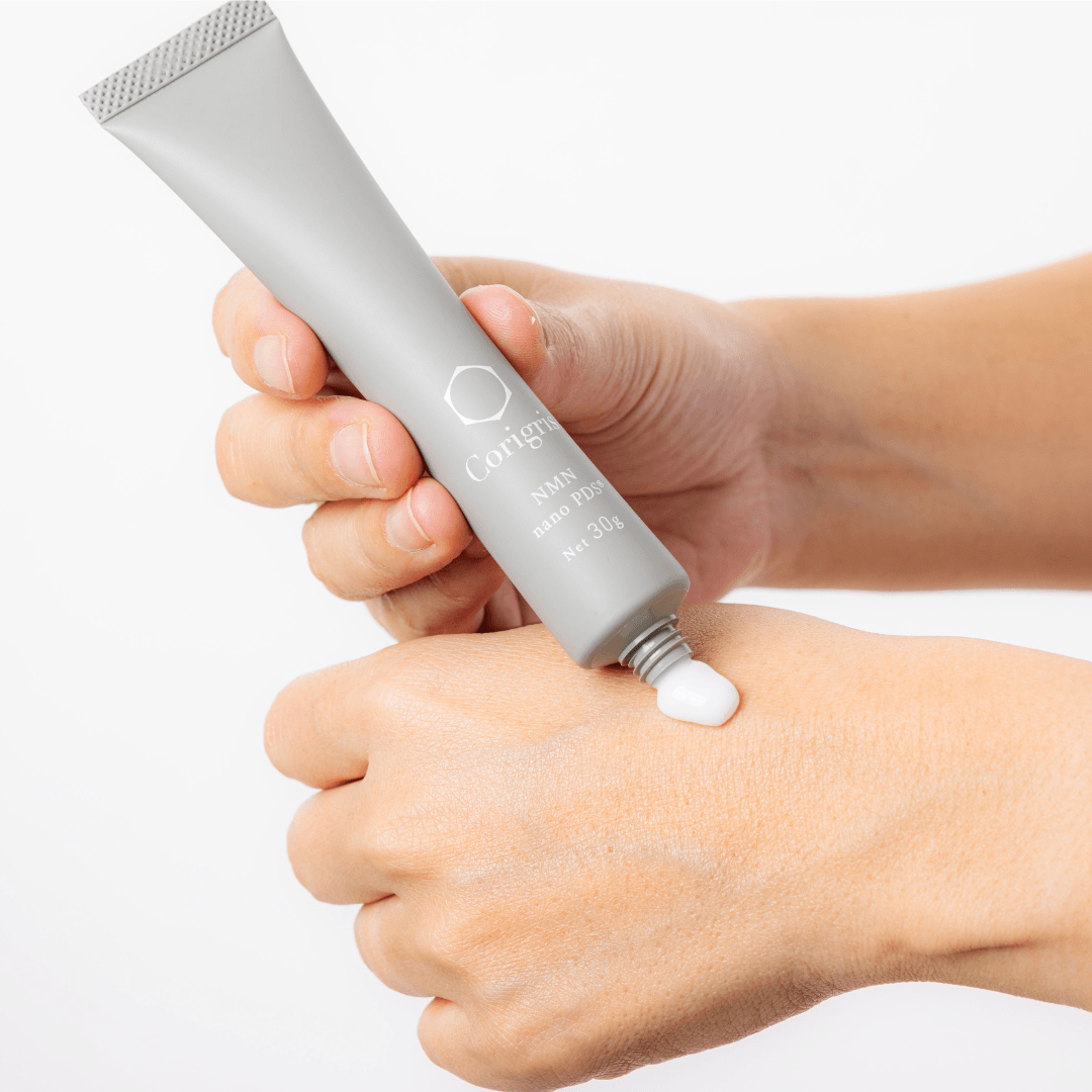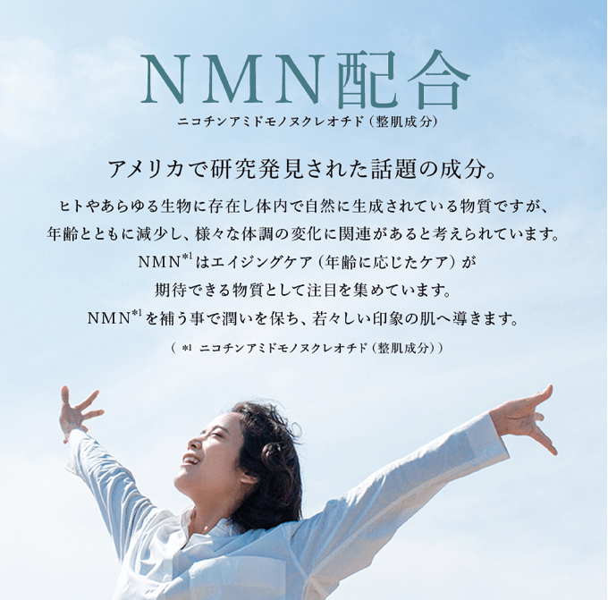 ヒトやあらゆる生物に存在した体内で自然に生成されている物質ですが、年齢とともに減少し、様々な体調の変化に関連があると考えられています。NMNはエイジングケア(年齢に応じたケア)が期待できる物質として注目を集めています。NMNを補うことで潤いを保ち、若々しい印象の肌へ導くことができます。