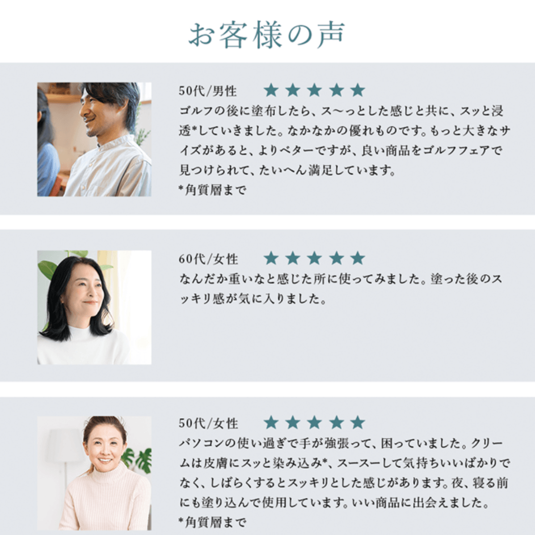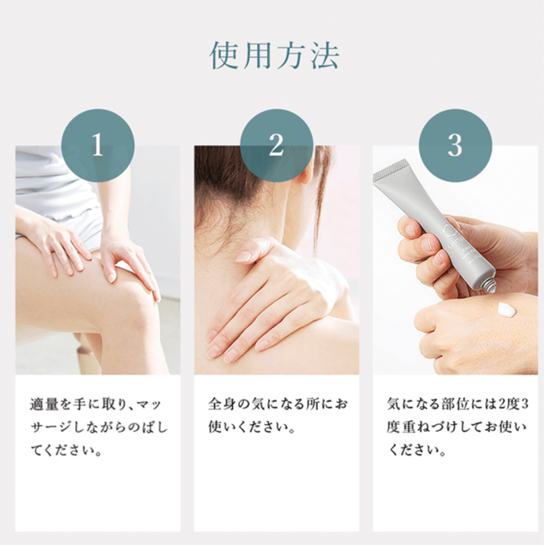 年々歳を重ねお悩みが増えてきた方々、また日々筋トレ、運動をされているあらゆる方々にも身体のホームケアとしてご利用いただけるクリームです。