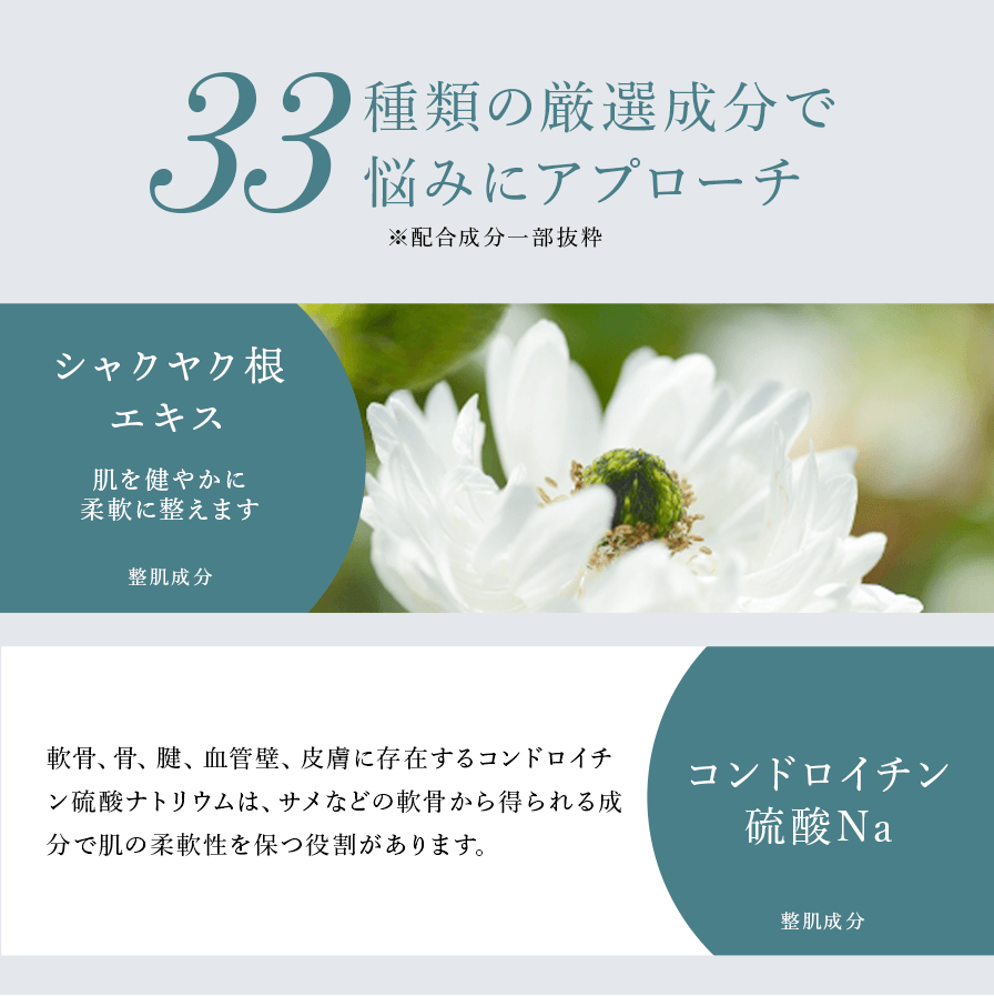 NMN(ニコチンアミドモノヌクレオチド)、グルコサミン、シャクヤクエキス、コンドロイチンをはじめ33種の成分を配合しています。