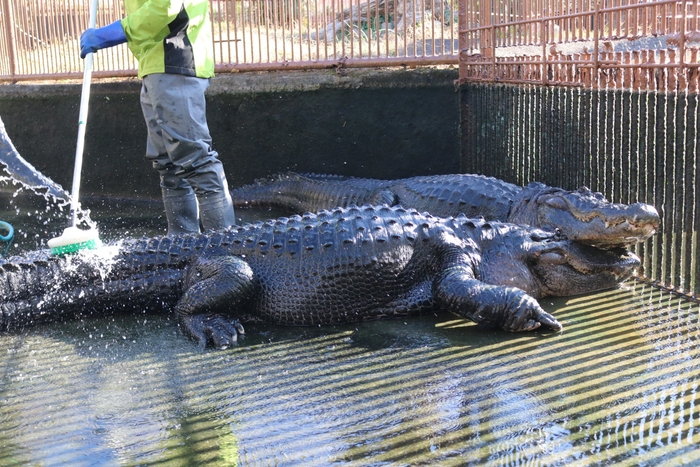 朝7時頃から池の水を抜き始め、開園時間の9時より、池の底や側面の掃除から始め、その後、ワニの背中の汚れを落とすためのブラッシングを開始いたします。