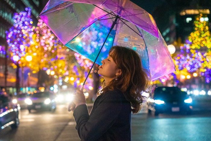 今年6月に販売開始すると、SNSで話題になり即完売となったWpc.™のオーロラビニール傘が大阪の冬の夜を彩ります。様々な角度からキラキラと美しく光り、見るたびに表情が変わる様子をぜひお楽しみください。