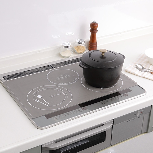 これまでのヒーター部分に敷く IHマットSOFT の「安全で」「焦げ付き汚れを防ぎ」「ピタッとフィットでズレない」という機能はそのままに、コンロヒーター部全面の汚れをカバーし、インテリア性もあるデザインで使いやすい『IHマットSOFT ワイド カトラリー柄グレー』を発売致しました。