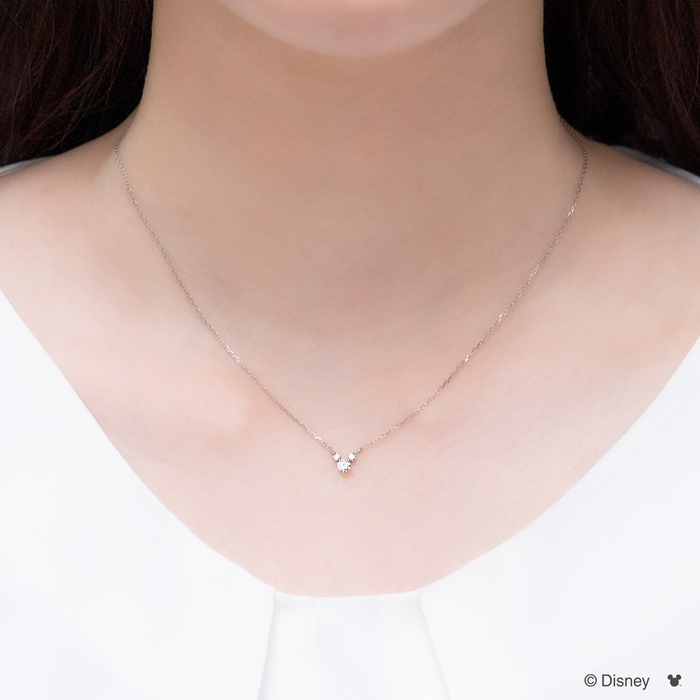 「ミッキーマウス」の人気アイコンをモチーフにしたネックレス。シンプルながらも3ピースのダイヤモンドが胸元に華やかさをプラスします。ダイヤモンドの石座(裏側)にもさりげなく「ミッキーマウス」のアイコンがほどこされています。