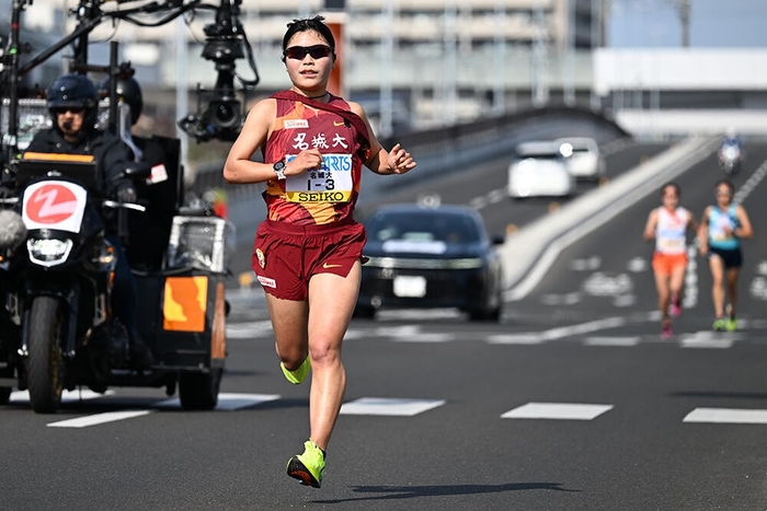 気温23.5度と比較的暖かい晴天の下、12時10分の号砲で26チームの第1走者がスタート。名城大学は副主将の米澤奈々香選手(人間学部3年)が3年連続で1区(6.6km)を担った。流れを決める重要なこの区間にはライバル校も有力選手を起用し、レベルの高い争いが繰り広げられた。最初の1kmは3分13秒で通過。米澤選手は集団の好位置につけたものの4km過ぎに先頭から離れだし、そこから差を広げられる展開に。