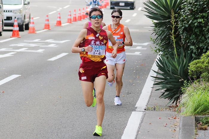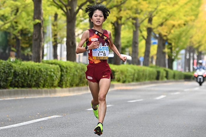 「自分の最大限の力を出す。1秒でも早くたすきを渡そうと思ってスタートラインに立った」と後に振り返るほど意気込んで走り出した。この区間ではトップが入れ替わり、立命館大学が首位を奪取。区間賞も立命館大学の山本釉未選手(1年)が獲得した。上野選手は拓殖大学にかわされたものの、前を走っていた兵庫大学を追い抜いて9位の順位を維持。中継点ではトップと1分24秒差で次の走者へたすきを託した。個人成績は13分23秒で区間10位。「初めての全国大会で全然戦えなかったのですが、すごくいい経験をさせてもらえたので、この経験を2ヵ月後の富士山女子駅伝や来年につなげていきたい」と、今後への糧を得る初駅伝となった。