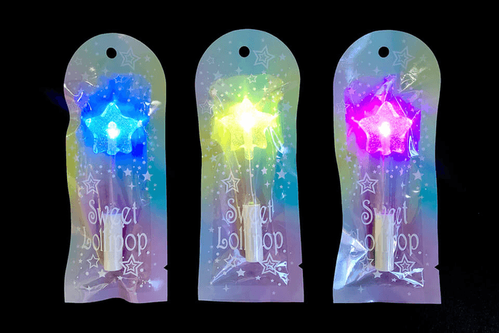 トゥインクルキャンディは、スティック下部にあるスイッチを押すと、スティック内部のLEDがレインボーカラーにピカピカと光るフォトジェニックなキャンディです。