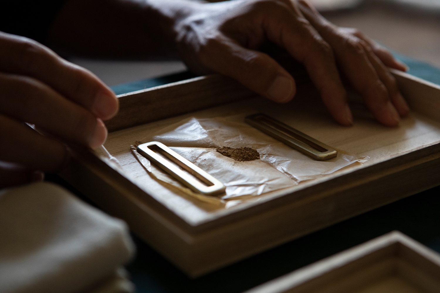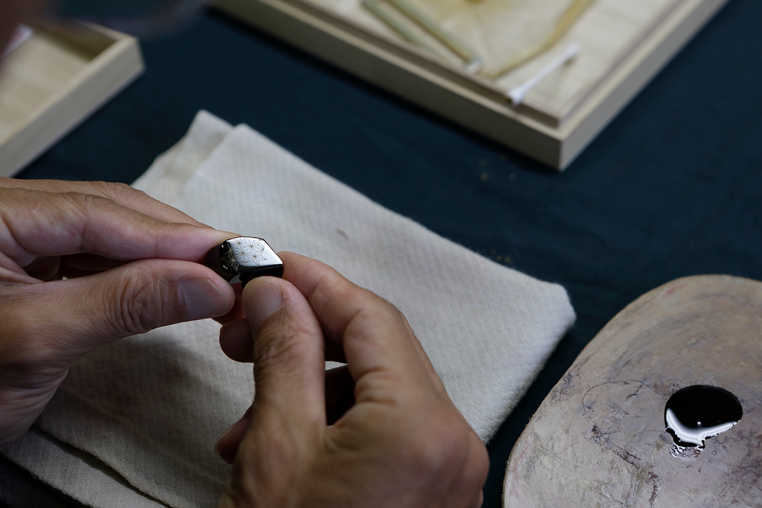麻の葉模様の細かい溝に、漆を塗り込み、立体的に輝くように金粉を塗り重ねていく作業は、高い集中力と技術が必要です。