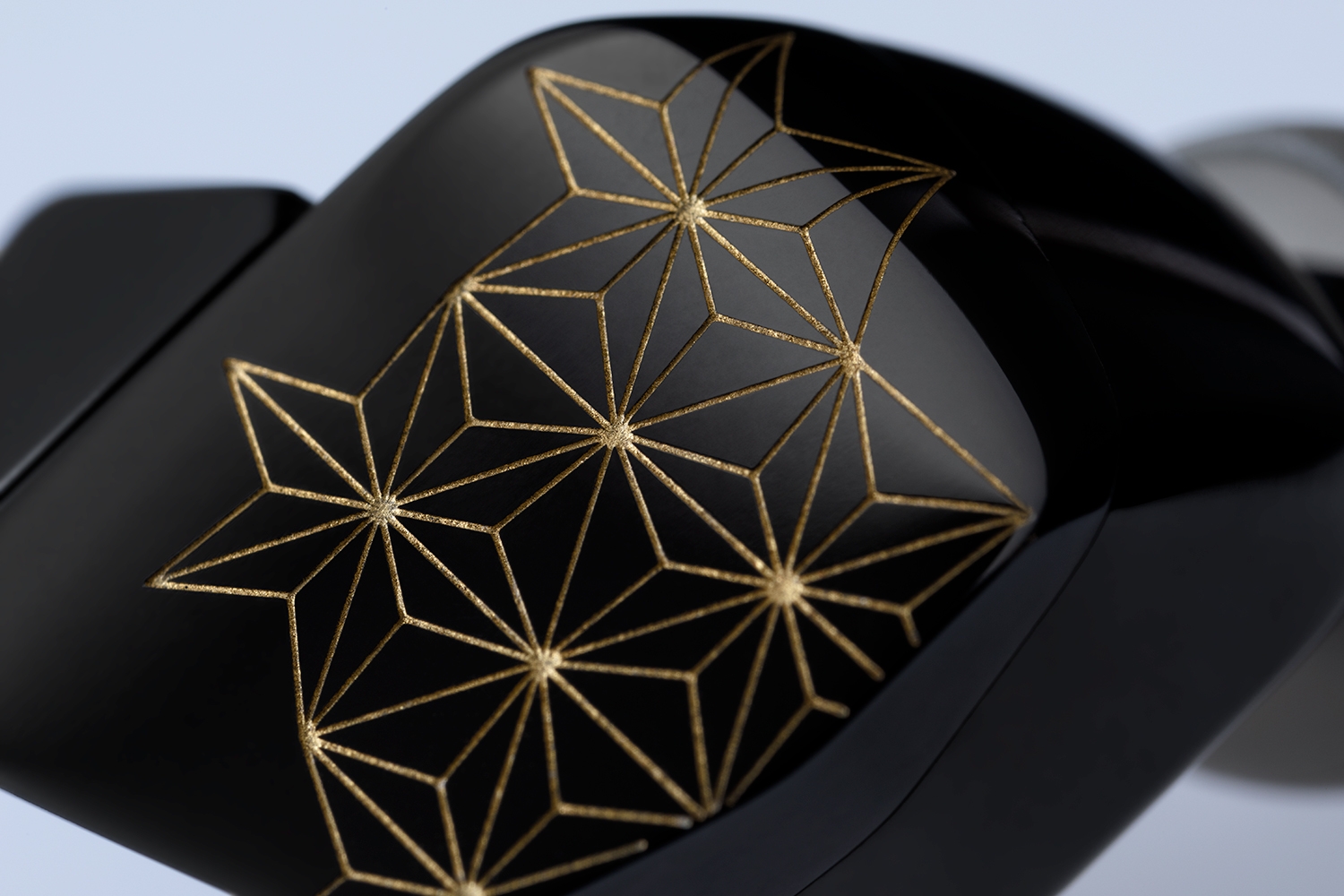この美しい文様をより美しく輝かせるために、本体色は呂色鏡面仕上げを施しました。呂色(ろいろ)とは、日本の伝統色の一つで、黒漆の濡れたような深く美しい黒色のことです。