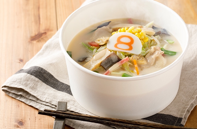 8番流「ちゃんぽんらーめん」は、生姜の香りとあさりの旨み、11種類の具材を使用した具だくさんのらーめんです。今年は辛みそで味変ができる「辛旨ちゃんぽんらーめん」も新登場です。