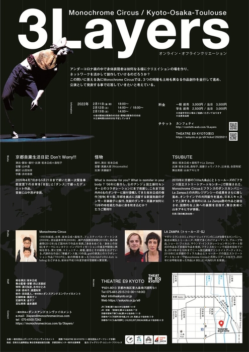一般社団法人 ダンスアンドエンヴァイロメント(京都府京都市、代表:坂本公成)主催による、Monochrome Circus/Kyoto-Osaka-Toulouse オンライン・オフラインクリエーション『3 Layers』が2022年2月11日 (金・祝) ~2022年2月13日 (日)にTHEATRE E9 KYOTO(京都府京都市)にて上演されます。チケットはカンフェティ(運営:ロングランプランニング株式会社、東京都新宿区、代表取締役:榑松 大剛)にて12月24日(金)より発売開始です。
