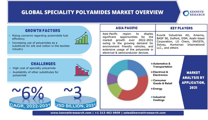 リサーチ・ネスターの一部門であるケネス・リサーチは最近、「スペシャリティポリアミド市場:グローバル需要分析と機会見通し2031」と題するリサーチレポートを発表し、タイプ別、用途別、地域別の市場セグメンテーションの観点からスペシャリティポリアミドの詳細な概要を提供しています。