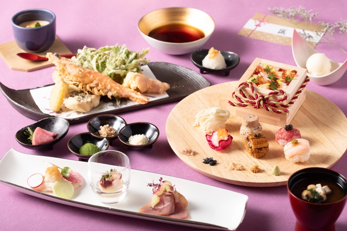 四季折々の美しい自然があふれる八事に佇むストリングスホテル 八事 NAGOYAで、和洋会席ご膳の冬限定メニューが登場。海鮮升寿しと6種の手毬寿しをお楽しみいただけます。海鮮升寿しは、ギフトボックスに見立てた升に、海鮮食材を盛りつけ、宝石のように彩り鮮やかに仕上げました。手毬寿しは、フォアグラ牛蒡や和牛肉炙りキャビア添えなど料理長が厳選した食材と、ゆり根のモンブランやなど、冬に旬を迎える食材が楽しめます。茶わん蒸しは、海老と伊勢真鯛を、仕上げに添えた柚子の香りと合わせて味わっていただけます。昼はご膳、夜は天使海老や五郎島金時の天麩羅などがついた会席のコースをご用意。また手毬寿しをおうちで楽しめる『祝手毬・冬~JUNI‐HITOE弁当~ 』も販売いたします。