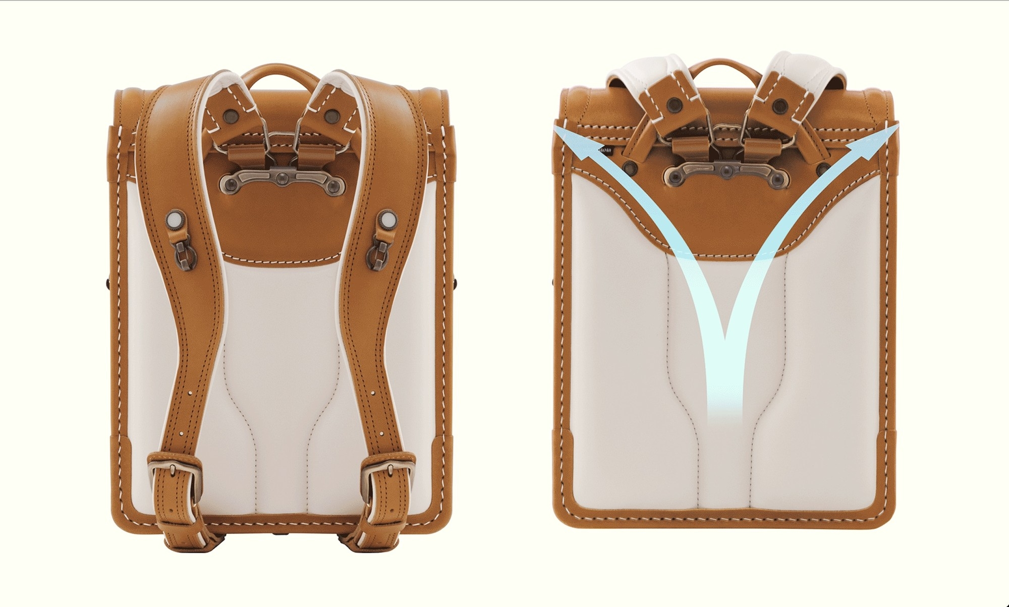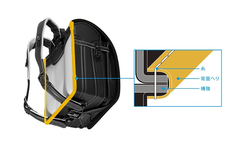 村瀬鞄行のランドセルは、「立ち上がり背カン」や「しっかりカーブベルト」「思いやり調節機能※実用新案登録済」を採用し、体のラインにフィットする設計によって重心を体に近づけ、体感重量を軽減。また、「Yライン背当て」により通気性を確保しながら横揺れにも強い安定感を実現しています。さらに学習院型の「へり」により、側面や底面を擦れや衝撃から守る構造を採用するなど、細部にまでこだわりが感じられます。