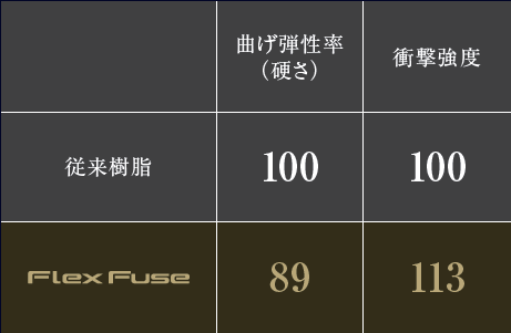 通常樹脂に衝撃吸収ポリマーを添加した新素材「Flex Fuse」をシャフト部に搭載することで、衝撃強度を高めつつ、柔らかさが11%※アップ。大きなしなりと柔らかい打球感をもたらします。