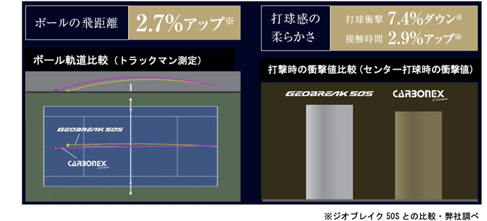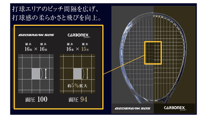 さらにストリングパターンは縦糸16本×横糸15本とし、従来品よりも横糸を1本削減。打球エリアのピッチ間隔を5%拡大することで、柔らかさと飛びを向上させました。