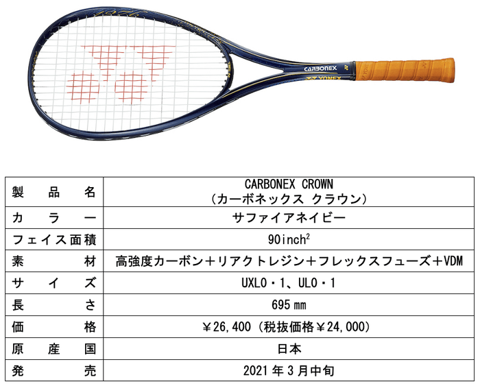 ヨネックス株式会社(代表取締役社長:林田草樹)は、ウッドラケット感覚の大きなしなりと柔らかい打球感が特徴のソフトテニスラケット「CARBONEX CROWN」を 2021年3月中旬より発売いたします。弊社往年のヒット商品・カーボネックス(TS-7000)を現代版に進化させたラケットを開発いたしました。