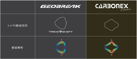 シャフト部には、薄く幅が広い逆R断面形状の新構造を採用することで変形量が24%※1増加。また通常樹脂に衝撃吸収ポリマーを添加した新素材「Flex Fuse(フレックスフューズ)」を搭載することで、衝撃強度を高めつつ、柔らかさが11%※2アップ。新設計・新素材により、大きなしなりと柔らかい打球感を生み出します。