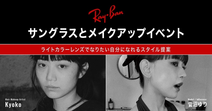 本イベントでは、雑誌や広告で活躍する人気ヘアメイクアップアーティストのKyokoさんと、ファッションやライフスタイルが注目されるモデル・インフルエンサーの菅沼ゆりさんが登場し、Ray-Banのライトカラーレンズとメイクの最旬スタイリングを提案します。