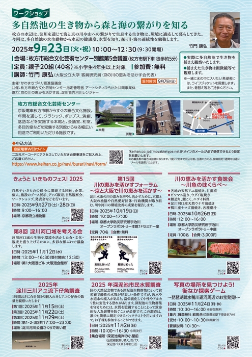 今回の秋バージョンでは「伏見の街づくりと『水」」、「伏見みなと物語 ~生まれる港・失われた港~」テーマとする講演会並びに「多自然池の生き物から森と海の繋がりを知る」と題して淀川の生き物を捕まえ観察するワークショップを開催します。地域の身近な自然や歴史・河川や水文化にふれ、まちの奥深さを楽しみながら京阪沿線をぶらり巡ってみてはいかがでしょうか。
