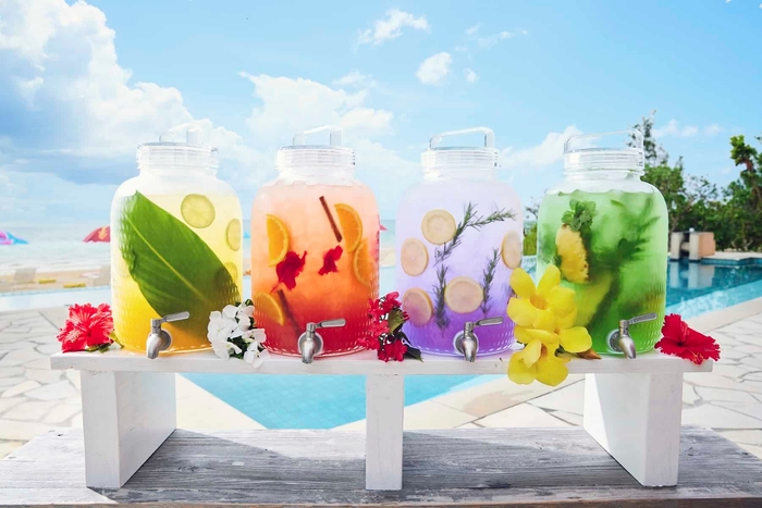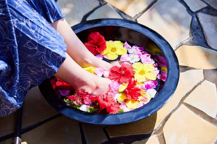 ビーチエリアに用意されたフラワーフットアイスバスに色とりどりのお花を浮かべます。足を浸すと、目の前にお花畑が広がっているような光景を楽しむことができ、南国らしい色鮮やかな花々のコントラストを楽しめます。
