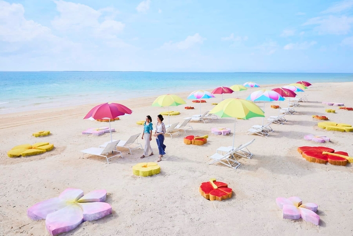 1 白砂のビーチエリアにお花のパラソルやアートが登場