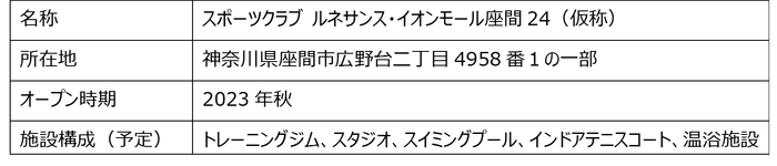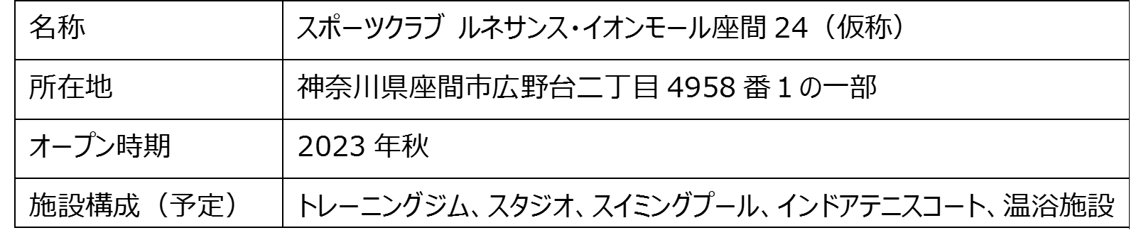 株式会社ルネサンス(代表取締役社長執行役員:岡本利治、本社:東京都墨田区)は、2023年秋に「スポーツクラブ ルネサンス・イオンモール座間24(仮称)」を、神奈川県座間市に出店することといたしましたので、下記の通りお知らせいたします。