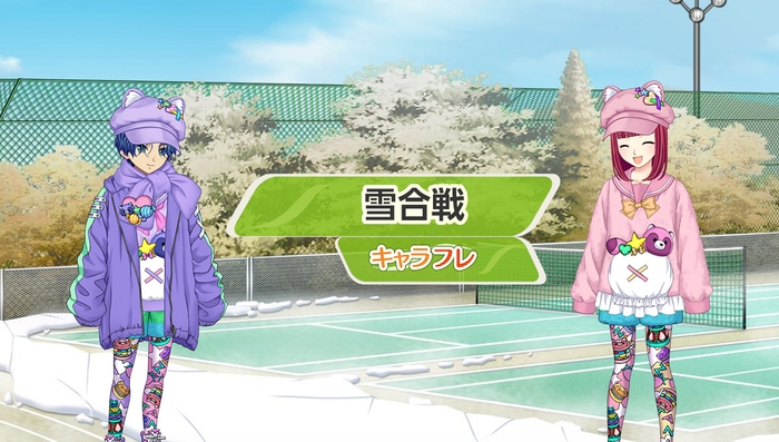すっかり雪が降り積もった翔愛学園の運動場では、テニスコートの左右に分かれて雪玉を投げ合う『雪合戦』イベントが開催中です。雪玉に混じってかわいいアクセサリやインテリアなどのアイテムが飛んでくることも?