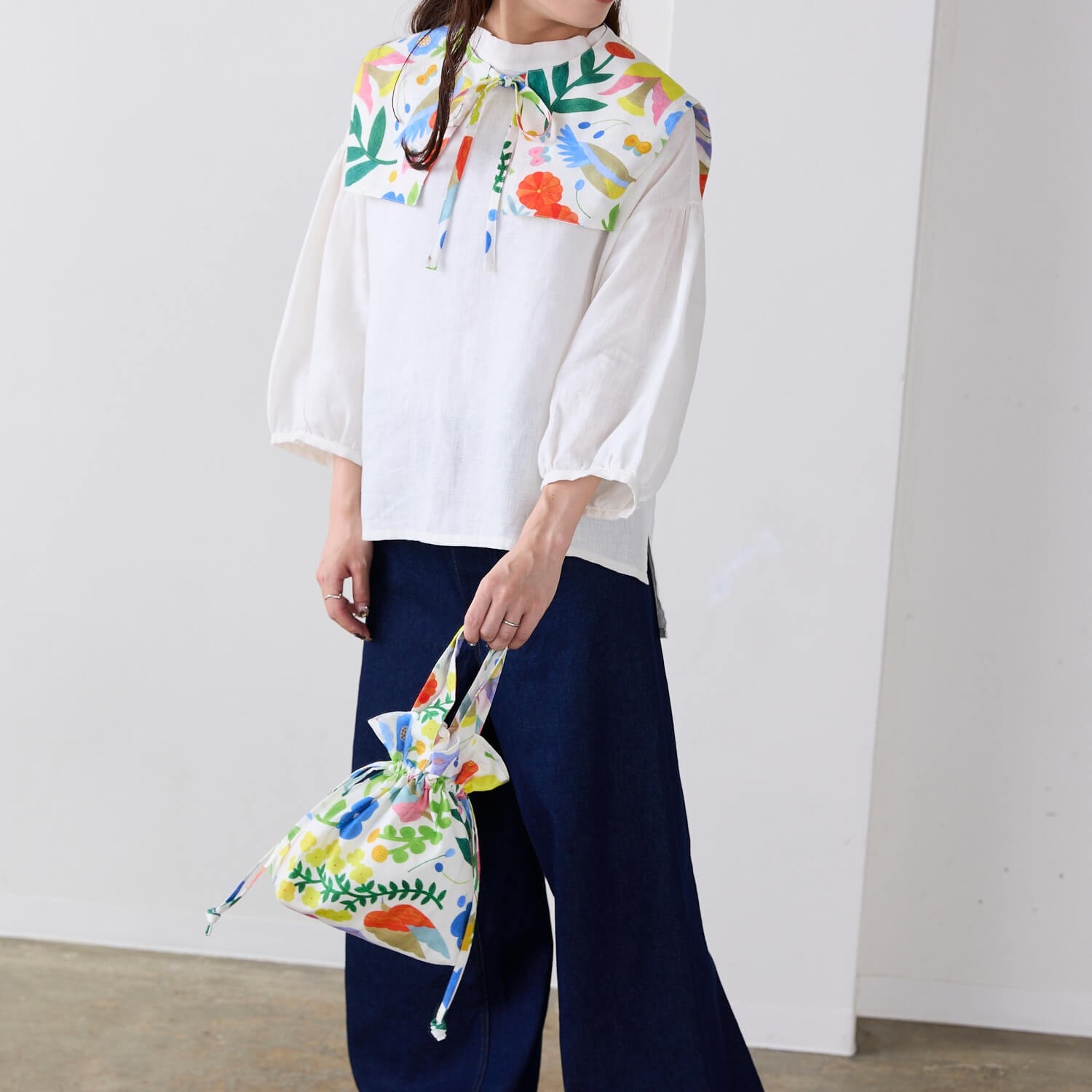 また、コラボ生地の発売を記念して、ご予約いただいた方全員に「付け襟」と「巾着バッグ」の作り方レシピをプレゼントいたします。