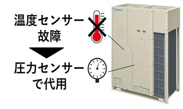 使用時に室外機の部品が故障した場合、部品の種類に関わらず修理を実施するまで再稼働できませんでした。『VRV Xシリーズ』では、センサーが故障した場合に一時的に他のセンサーで制御を代用することで、室外機搭載の部品故障のうち約60%が応急的に運転できるようになり、空調故障による完全停止の頻度を抑制します。