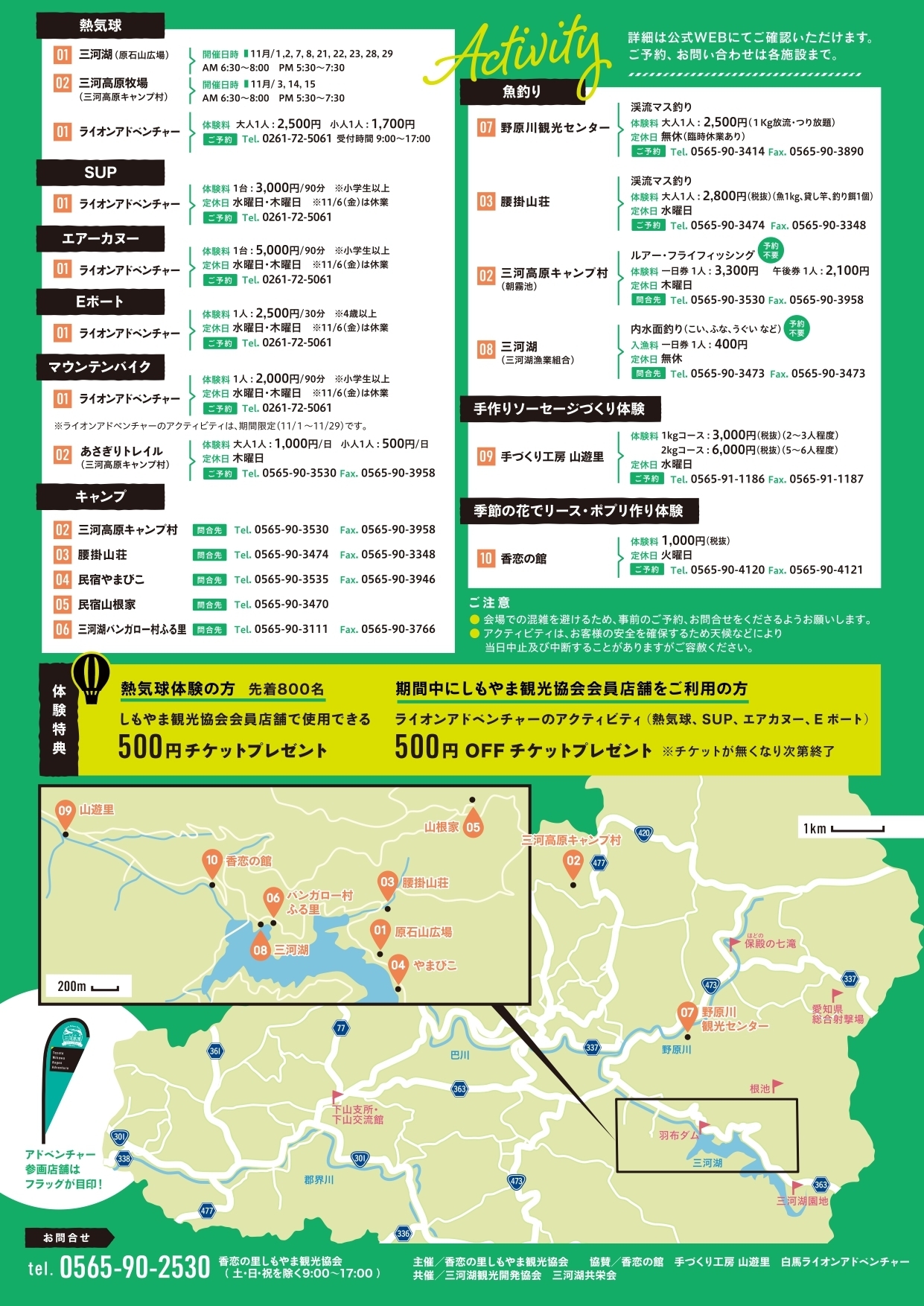 愛知県最大の灌漑用人口湖、三河湖とその周辺で熱気球搭乗体験、SUP、マウンテンバイク、渓流釣りなど、秋の三河高原を満喫できるアクティビティが体験できます。更に今年は今までの体験に加え、魚釣りやキャンプなどのコンテンツが増え、イベントがパワーアップ。また、期間中しもやま観光協会会員店舗を利用した方にはアクティビティで、熱気球を体験した方にはしもやま観光協会会員店舗で使用できる500円割引券をプレゼント(数量限定、先着順)。更に今なら、ツーリズムとよたの公式LINEのお友達登録でもライオンアドベンチャーのアクティビティが500円OFFになるクーポンがもらえます。ご予約前に登録をどうぞ!(登録用URL: https://line.me/R/ti/p/%40zuz6612i )