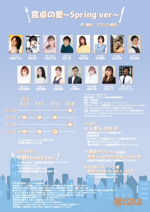 本公演は、フォーエスエンターテインメント×ゴブリン串田(劇団新劇団)のプロデュース企画です。 会場は中野で25年の歴史を誇る小劇場中野studio twl。 経営交代してからは、初の劇場主催での舞台公演となります。 作品は2017年の初演以来、様々な形でお送りしてきた『食卓の愛~Spring Ver~』。