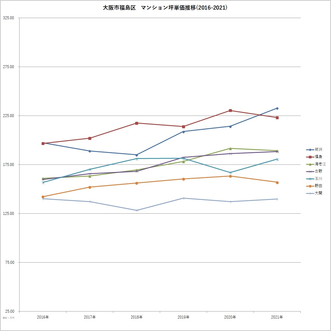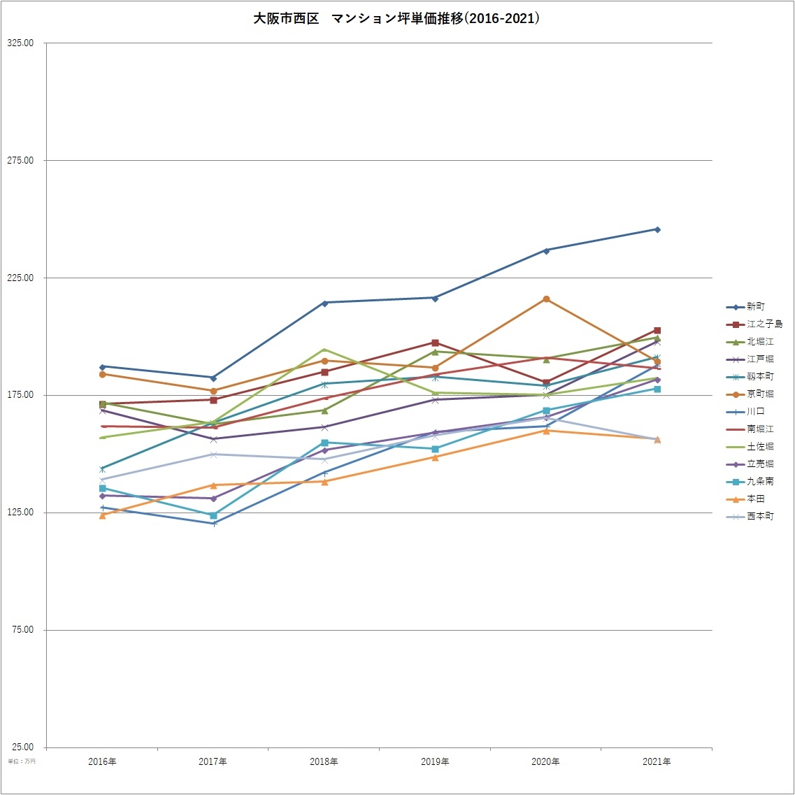 「不動産×WEB×ビッグデータ」の領域で、さまざまな不動産テックサービスを展開する株式会社ワンノブアカインド(本社:東京都港区、代表取締役社長:川島 直也、以下当社)は、当社が運営するマンション情報サイト「マンションレビュー」の保有データを元に、「大阪都心6区(福島区・西区・天王寺区・浪速区・北区・中央区」の各町名における、中古マンション相場および2016年からの相場推移について調査。最新の中古マンション価格*1とあわせて、2016年の坪単価と比較した騰落率のランキングを発表いたします。