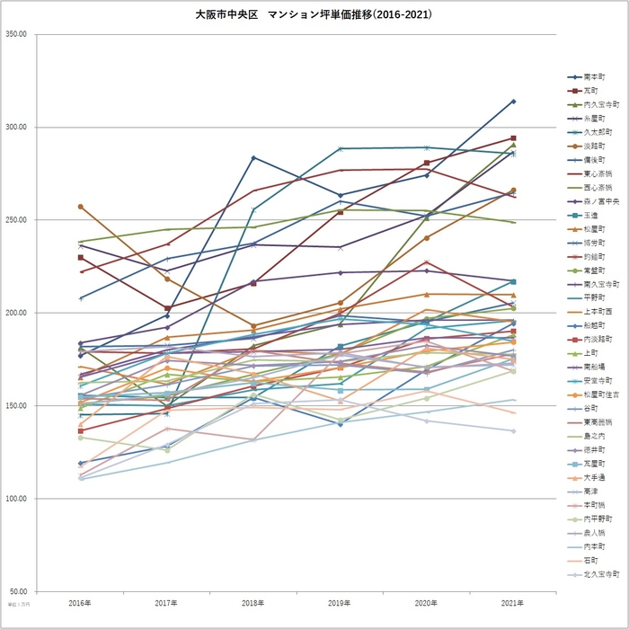 ・1位は「中央区久太郎町」の+96.73%。2016年と比較して、坪単価が約2倍弱まで上昇した。