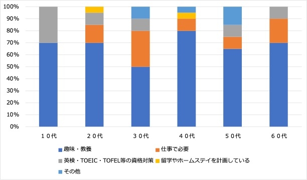 次に、英語などを勉強する目的について尋ねたところ、どの年代ももっとも多い回答は「趣味・教養」でしたが、20代以上は「仕事で必要」と答える人も多いことがわかりました。また、10代も含めると「資格試験対策」として英語などを勉強している人も全体の1割を占めています。近畿エリアには、このように仕事もしくは資格試験対策を目的に勉強している人が多く、その数は全国最多タイ。明確な目標を持ちながら勉強している人が多いことが、語学力が高い理由に関係しているのかもしれません。
