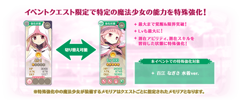 対象の魔法少女を編成して本イベントクエストをプレイする際に、ステータスを特殊な状態に強化することができます。